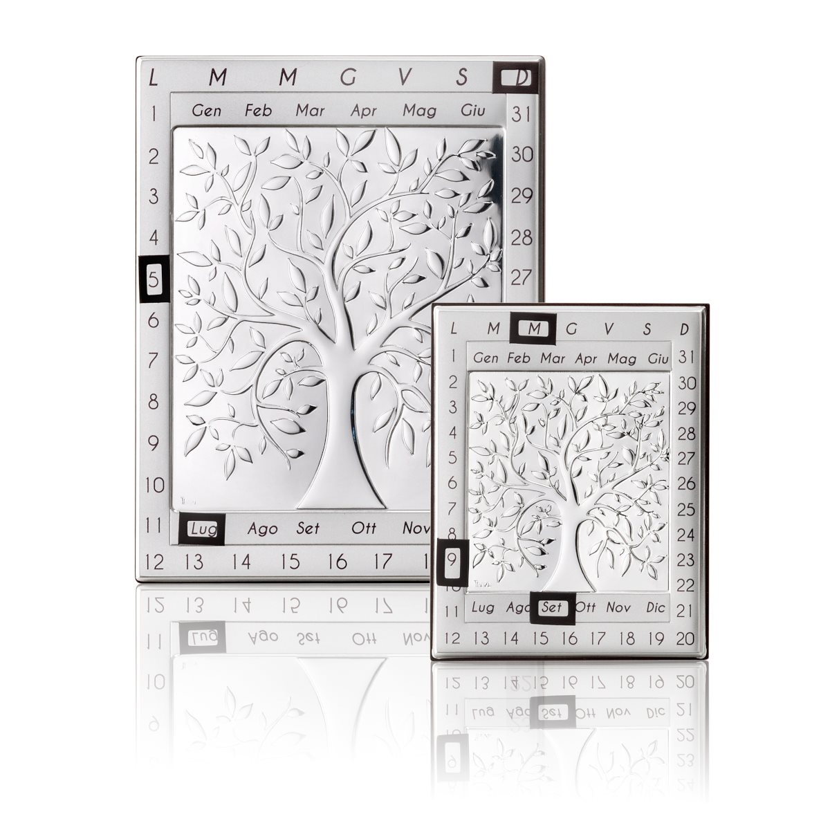 Il calendario perpetuo è un oggetto affascinante e una piccola sfida per chi si impegna nella sua progettazione, che consiste nel contenere, in un piccolo oggetto, tutti i giorni dell’anno di tutti gli anni che possiamo immaginare. Nella linea Thilia di Camilletti, ne troviamo una versione da appoggio (predisposta anche per essere appesa) che consiste in un pannello in legno rivestito in argento laminato, su cui si possono far scorrere dei piccoli magneti che, in maniera equivalente al cerchio rosso sul calendario, ci permetteranno di tenere traccia della data e del giorno della settimana. La decorazione scelta per il calendario – un albero della Vita - non poteva essere più indovinata. L’albero è infatti un potente simbolo di ciclicità; le sue fronde, su cui in Natura si alternano le gemme, i fiori e i frutti, fino alla caduta delle foglie, ci ricordano non solo il susseguirsi delle stagioni meteorologiche, ma anche di quelle della nostra esistenza. Insieme al calendario, diventerà un compagno con cui iniziare la giornata, attraverso il piccolo rito dell’aggiornamento della data. E se decideremo di regalarlo, chi lo avrà ricevuto in dono, non potrà fare a meno di dedicarci un pensiero ogni giorno! I materiali scelti per la realizzazione sono un pannello in fibra di legno color wengé e l’argento laminato, ottenuto depositando uno strato di particelle d’argento sull’anima in lega metallica della piastra, attraverso l’innovativo procedimento elettrogalvanico PVD (physical vapor deposition). Il disegno dell’albero è ricavato a sbalzo sulla superficie lucida, mentre il bordo, su cui sono disposti i giorni del mese, della settimana e i nomi dei mesi, ha una finitura satinata. Nella versione più grande, il calendario misura 16,5 cm X 21 cm. È fornito in scatola originale in cartone rigido, completa di logo e garanzia del produttore.