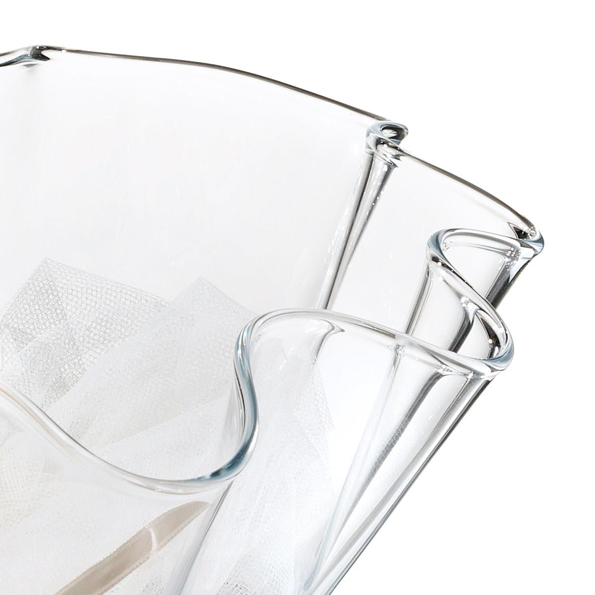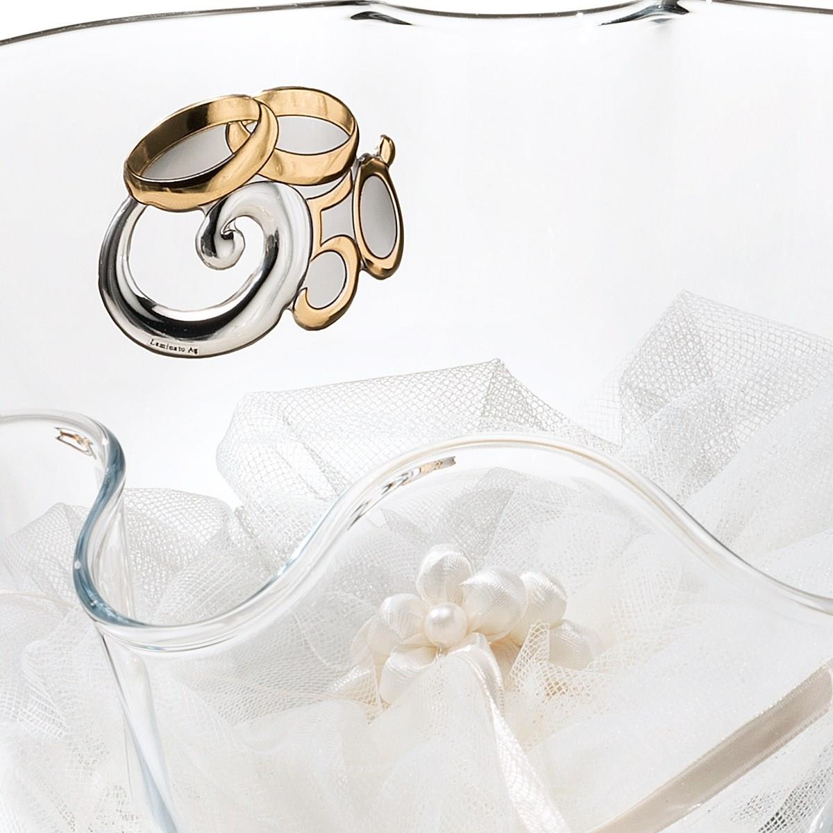 Valenti sceglie l’intramontabile lavorazione a fazzoletto per il centrotavola in vetro di alta qualità dedicato al cinquantesimo anniversario di matrimonio, ricavando un complemento d’arredo senza tempo, adatto sia ad un gusto classico che moderno. A ricordo del festeggiamento, lo completano un’applicazione in argento laminato, decorata da due fedi intrecciate e dal numero 50, in rilievo e dorati, e una decorazione in tulle bianco con un fiore in stoffa. La ciotola ha un’altezza di 14 cm e il diametro maggiore di 28 cm. È realizzato artigianalmente, come attestato dalla garanzia che completa la scatola da regalo con cui è fornito.