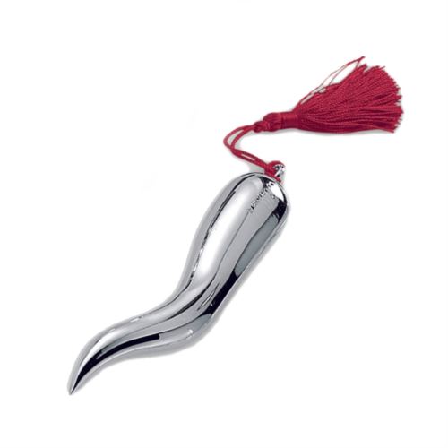 Scultura in resina con finitura argentata che riproduce il cornetto o corniciello napoletano, corredata di una nappina in tessuto di colore rosso. Piccolo soprammobile benaugurante, può essere un’idea regalo divertente o una bomboniera originale. Ha una lunghezza di 8 cm ed è fornito in scatola originale, con garanzia che ne attesta la produzione artigianale e italiana.