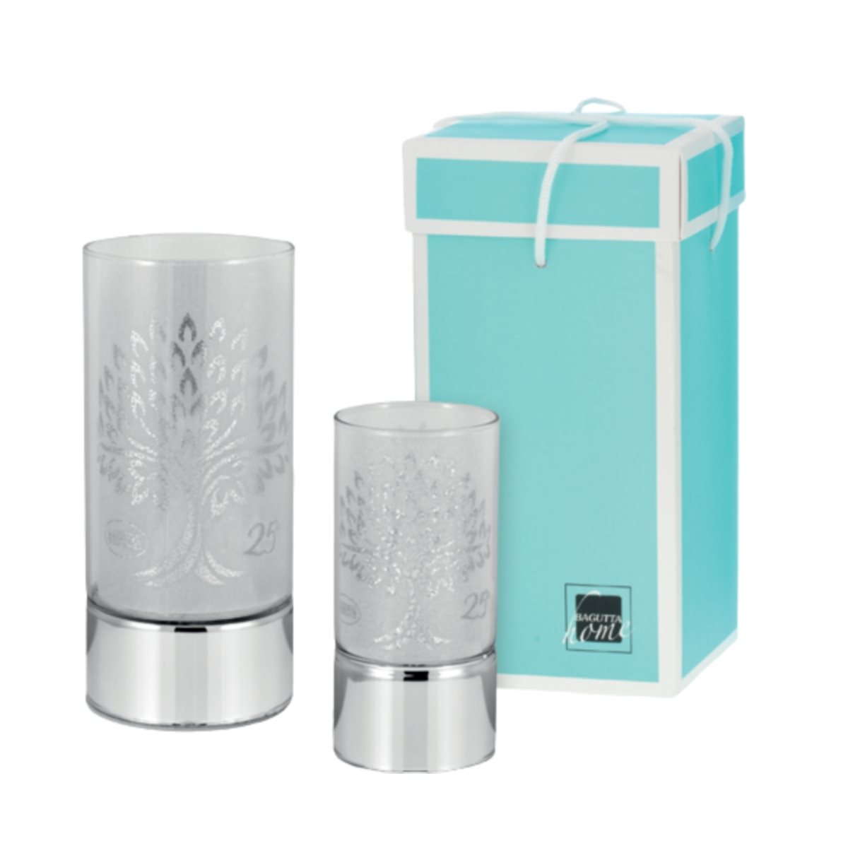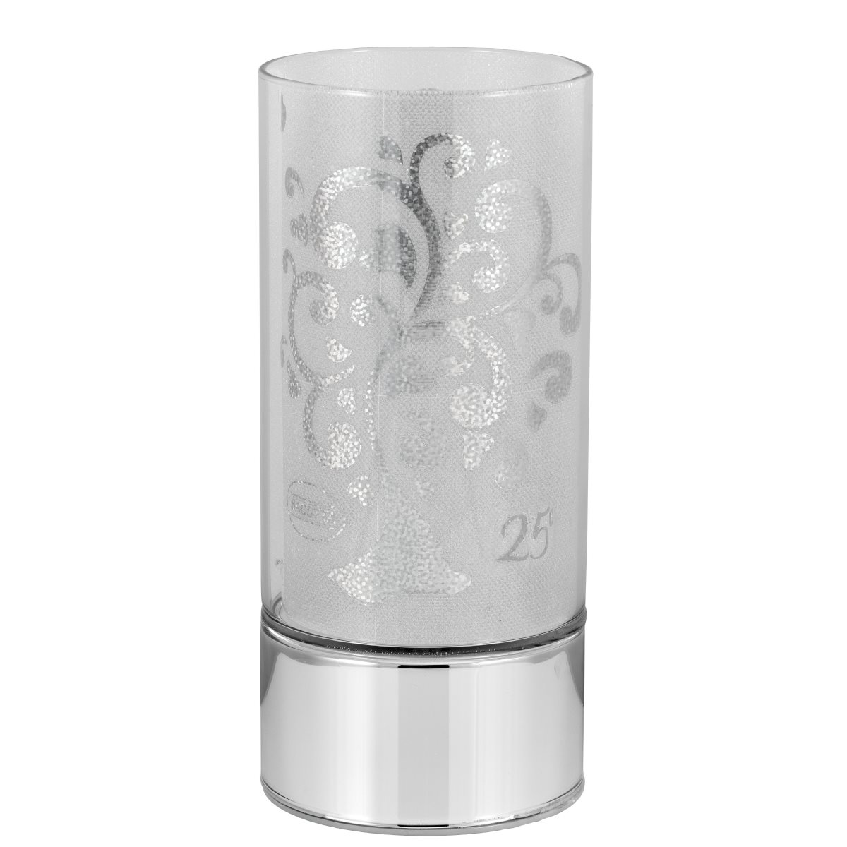 Tra le idee di Bagutta pensate per festeggiare il venticinquesimo anniversario di matrimonio, troviamo questa lampada wireless con funzionamento a batterie AAA (incluse nella confezione). È composta da una base in argento laminato a finitura liscia e da un cilindro in vetro. All’interno del cilindro, è posta una stampa satinata, decorata con un albero della Vita, circondato di cuori argentati e dal simbolo del 25°, e illuminata da un filamento di luci led, anch’esso posto all’interno del cilindro. La stampa può anche essere rimossa per poter godere la poesia della luce dei piccoli led attraverso la trasparenza del vetro. La semplicità e l’eleganza della lampada la rendono adatta a essere posizionata in ogni stanza della casa, per creare un’atmosfera calma e rilassante. Per rendere più originale questo oggetto, sarà inoltre possibile sfruttare l’ampio spazio a disposizione sulla base per una personalizzazione con un’incisione, come ad esempio una dedica, una data o i nomi dei festeggiati. La lampada ha un’altezza di 20 cm e un diametro di 9 cm ed è fornita con confezione regalo in cartone rigido, con logo e garanzia del produttore.