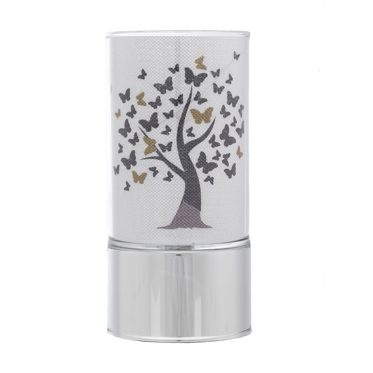 Piccola luce di ambientazione da tavolo cilindrica, in vetro, con la base in metallo argentato. È decorata con una stampa satinata che riproduce un albero circondato da farfalle e che può essere rimossa. All'interno è posto un filamento con piccoli led che producono una luce soffusa e che funziona con batterie già incluse nella confezione. Ha il diametro di 7 cm e l'altezza di 15 cm.