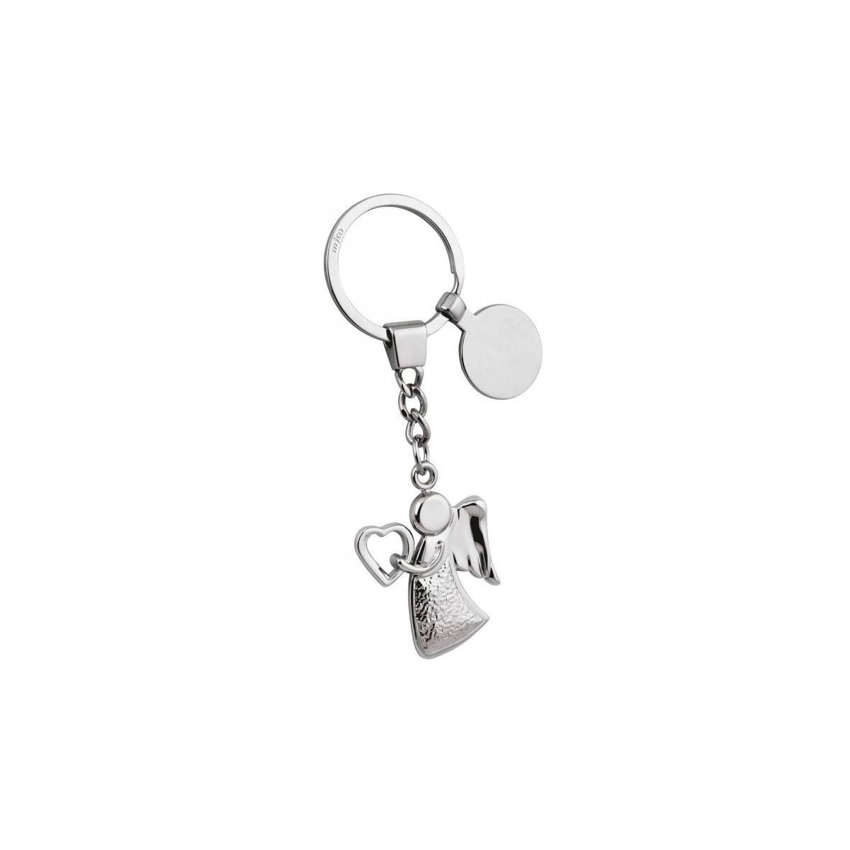 Portachiavi in acciaio lucido con anello brisè, catena e piccola piastra rotonda per incisione. Adatto anche come idea per una bomboniera, è decorato con un ciondolo che riproduce un angelo di profilo che stringe un cuore. Ha una larghezza di 3,5 cm e una lunghezza di 10,5 cm. Viene fornito senza scatola.