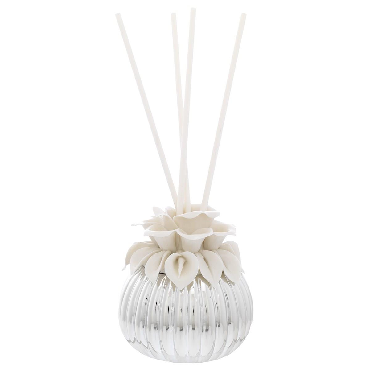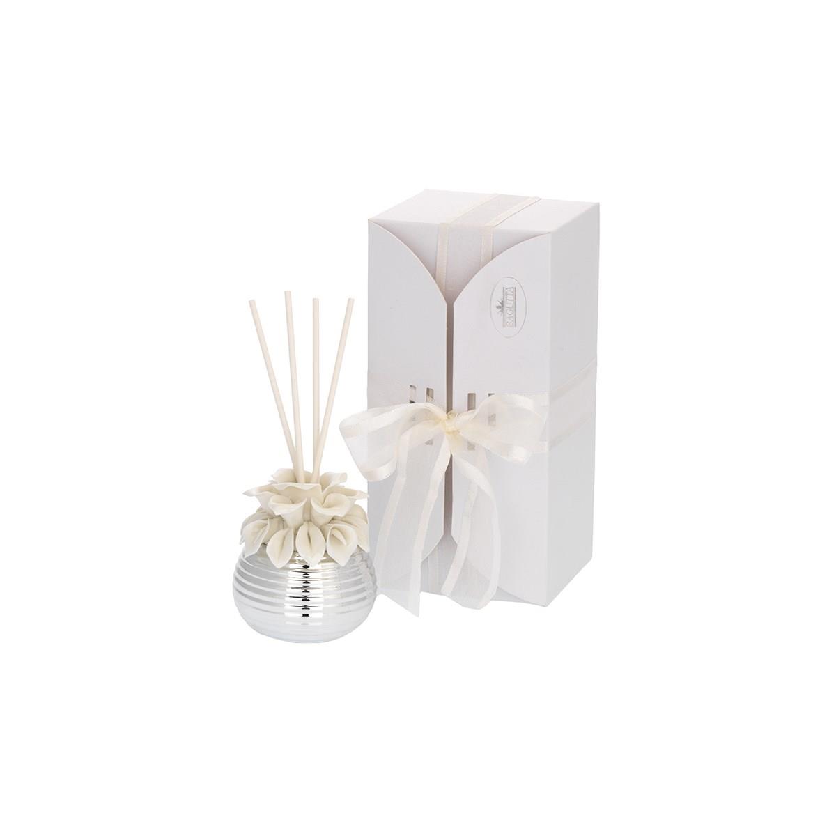 Bomboniera romantica e indicata per un matrimonio, questo diffusore per essenze possiede una raffinatezza che lo rende adatto anche per Battesimo, Comunione e Cresima. Si compone di un vasetto in resina argentata e lavorata a spicchi e di una decorazione composta da un elegante bouquet di calle in ceramica bianca. I bastoncini profumatori e l'essenza, così come la confezione per bomboniera sono inclusi. Misura 9X10.