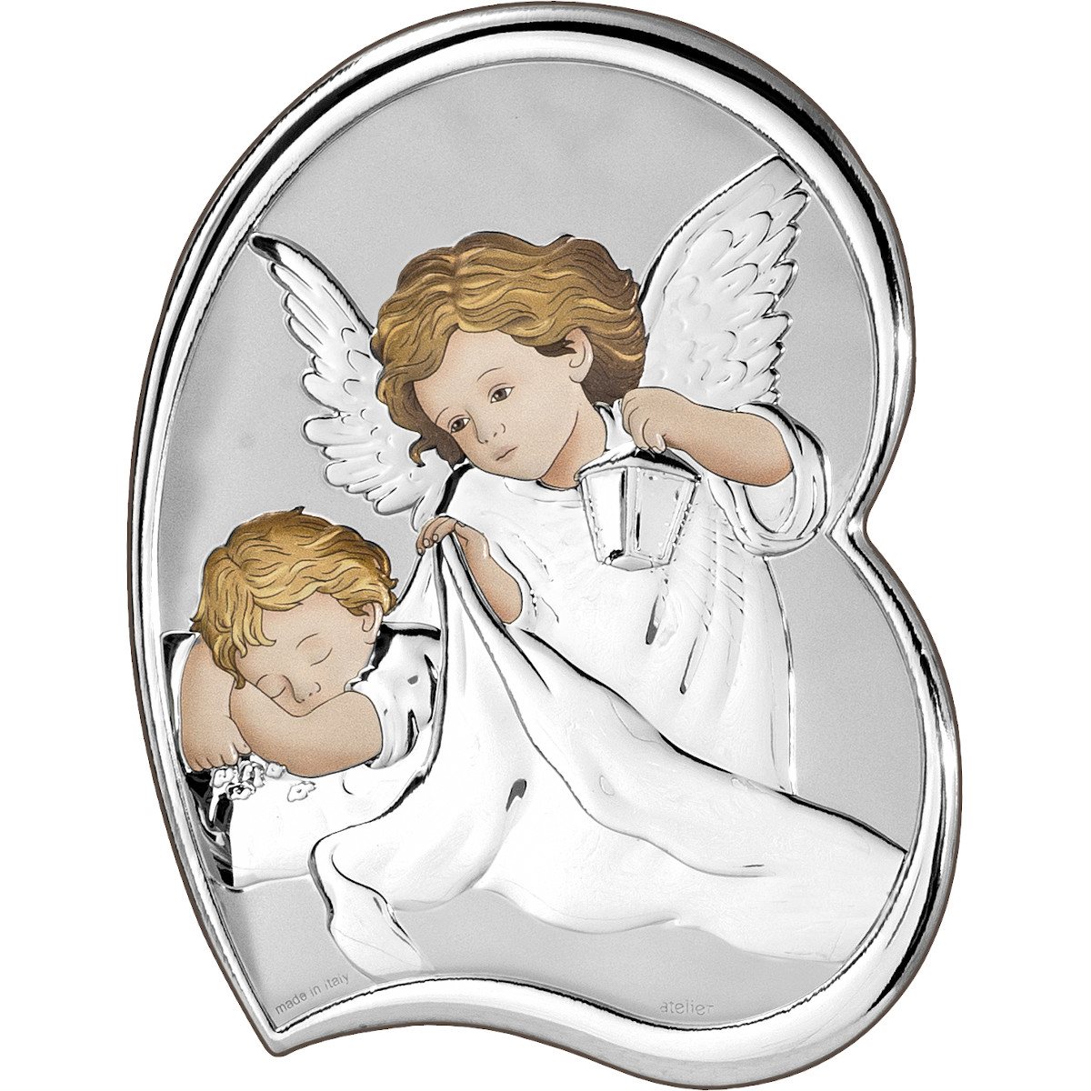 Icona moderna a forma di cuore che raffigura un Angelo Custode mentre veglia su un bimbo addormentato, reggendo una lanterna. Sulla superficie si alternano la finitura lucida e satinata dell'argento laminato con cui è realizzata. Le figure sono arricchite da dettagli con finitura a effetto ceramica colorata. Ha il retro in legno bianco. Misura 16 cm X 20,5 cm.