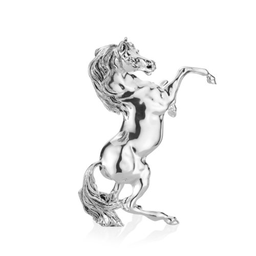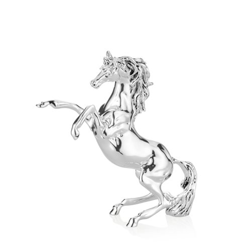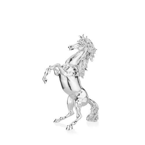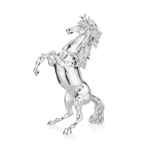 Scultura in resina argentata, alta 14 cm, che raffigura un cavallo impennato. Il materiale č lavorato con grande attenzione ai dettagli, dai particolari della criniera e della coda alla muscolatura del corpo. Animale molto amato anche da chi non č appassionato di equitazione, il cavallo simboleggia la libertā e lamore per uno stile di vita anticonformista. Puō essere un'idea regalo molto apprezzata come soprammobile elegante e originale o in occasioni speciali come, ad esempio, la festa del papā. La scultura č realizzata con tecnica artigianale in Italia, come attestato dalla garanzia che la accompagna nella sua scatola originale.