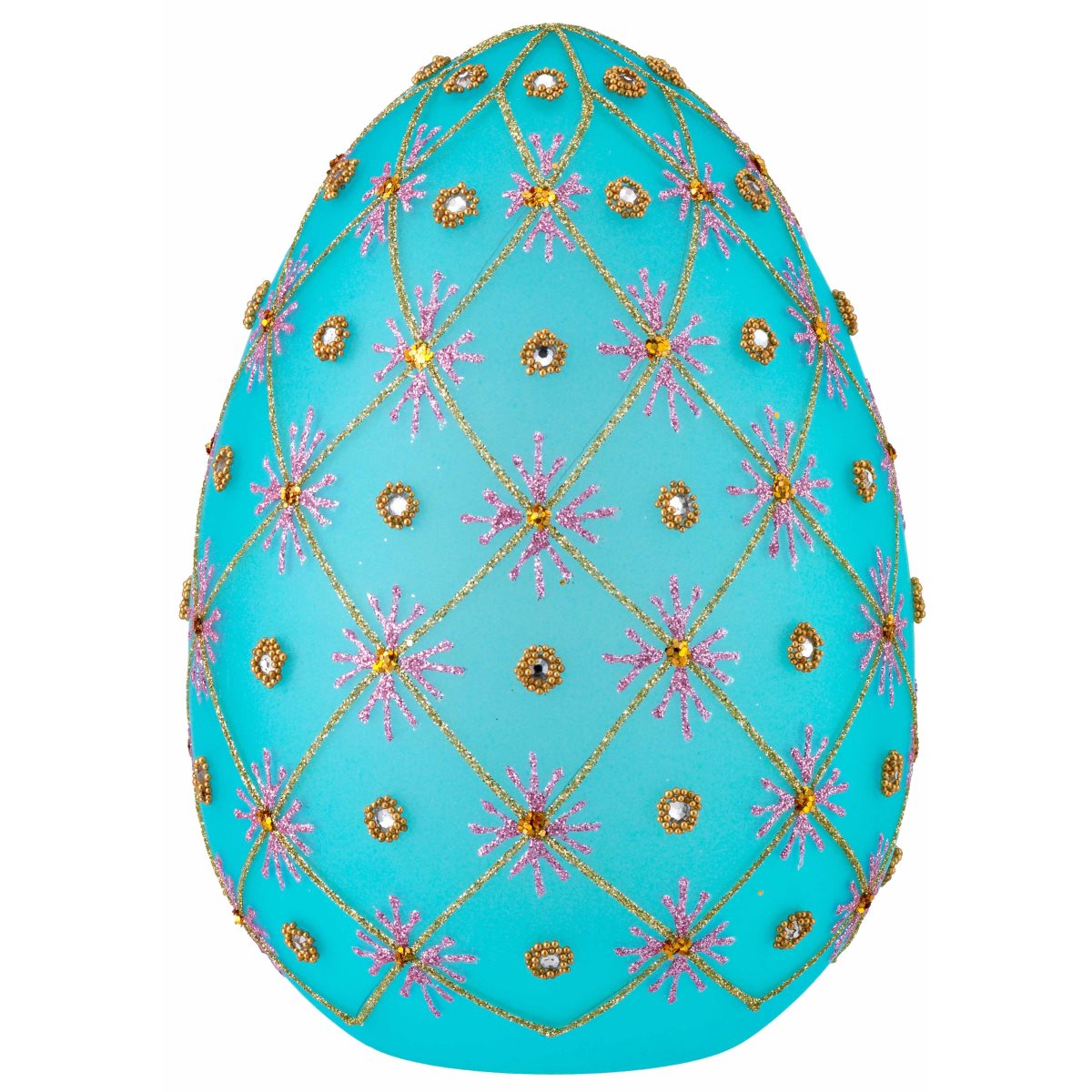 Prende ispirazione dalle preziosissime e famose uova di Fabergé, l'uovo che Bagutta propone come idea regalo originale e divertente per Pasqua. La superfice in vetro soffiato di colore azzurro è decorata con un motivo a losanghe, realizzato con strass e glitter. All'interno è nascosto un filamento led, la cui luce calda traspare attraverso il vetro traslucido, accrescendo il significato di rinascita tradizionalmente attribuito all'uovo e rendendolo molto apprezzato anche nella veste di luce da compagnia. Ha dimensioni di 14 cm X 20 cm ed è fornito in una confezione regalo colorata, con logo e garanzia del produttore. Le batterie per i led sono incluse.
