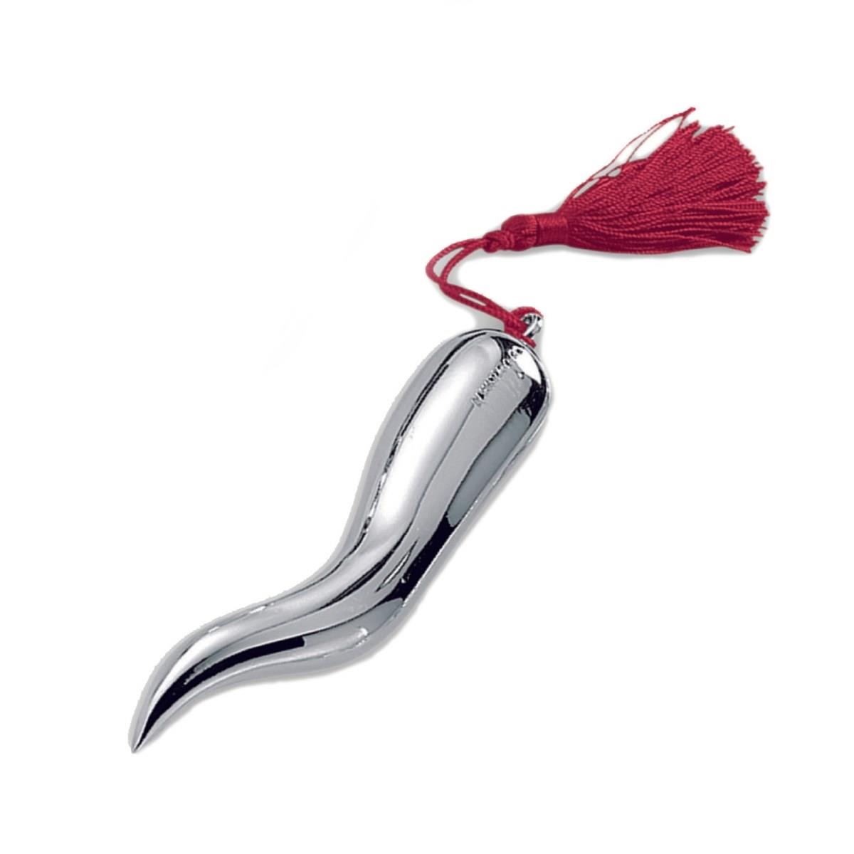 Scultura in resina con finitura argentata che riproduce il cornetto o corniciello napoletano, corredata di una nappina in tessuto di colore rosso. Piccolo soprammobile benaugurante, può essere un’idea regalo divertente o una bomboniera originale. Ha una lunghezza di 10,5 cm ed è fornito in scatola originale, con garanzia che ne attesta la produzione artigianale e italiana.